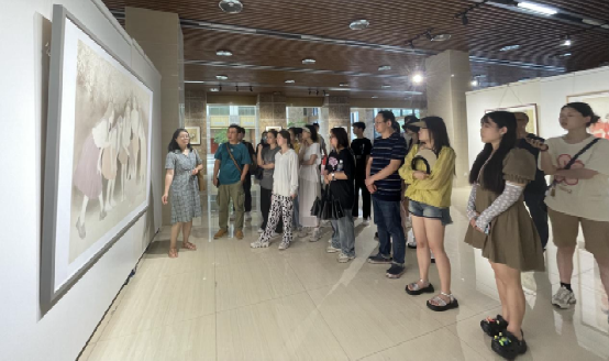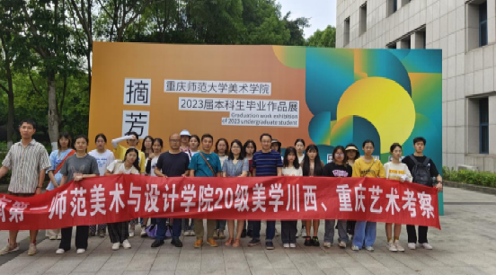 座谈会之前,湖南一师美术与设计学院3名教师带领81名学生来到重庆师范大学博雅楼展厅,参观了重师美术学院2023届“摘芳”美术学(师范)专业和研究生毕业作品展。