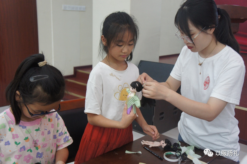 团队成员引导学生玩偶服饰制作