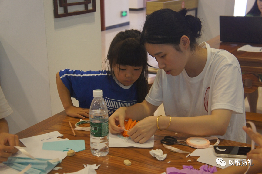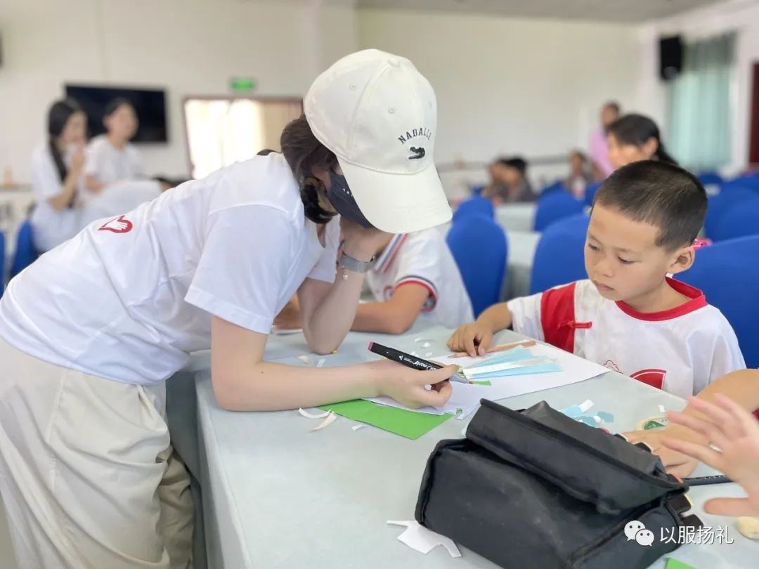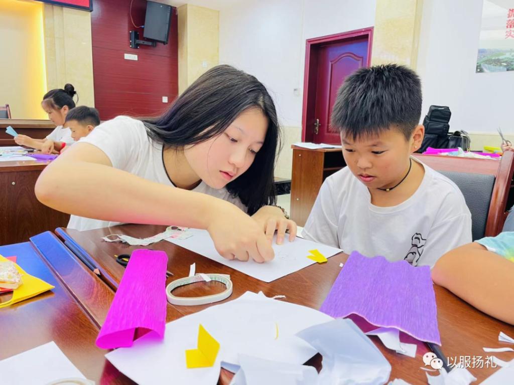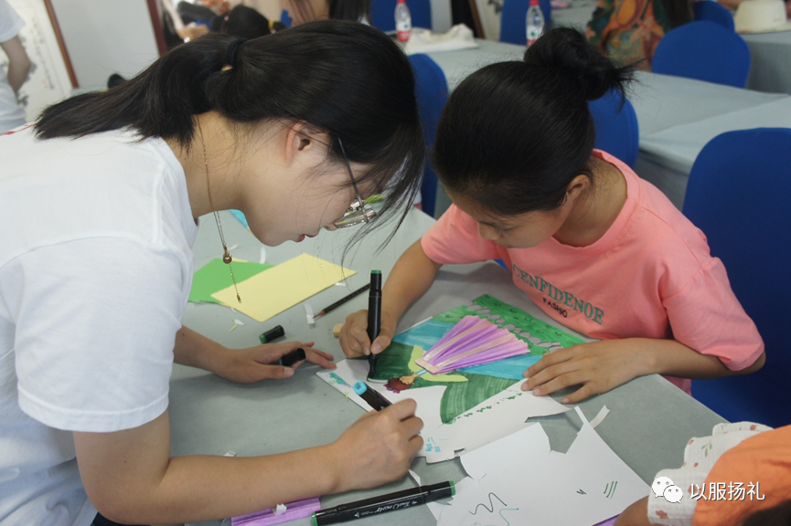 团队成员指导同学制作拼贴画