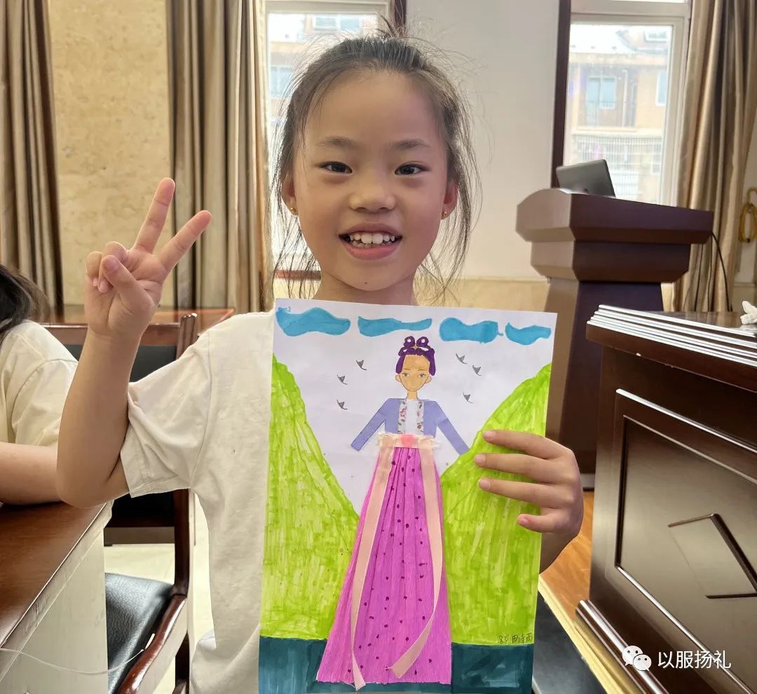 每一次课程活动,以服扬礼团队都根据授课对象的年龄阶段和知识水平,灵活安排课程内容,针对性地设计教学活动、孩子作品类型,采用不同的教学方法,开展不同的美术实践活动。在18日和20日的教学活动中,团队采用了《武则天的新装》为题的唐代服饰课程,课程以精致的皮影戏动画和华丽的唐装舞蹈视频为导入,并设计了几个问题让学生思考。团队教师根据同学们表述的不同观点,总结出了武则天的“聪明好学”、“有勇有谋”、“坚韧不拔”、“志向远大”、“心系天下”的四个精神和唐代服装服饰形式特点,在此基础之上,讲授服装相关知识,和小朋友们共同见证了唐朝“兼收并蓄,思想开放”的服饰特点,让学生在轻松愉快的学习氛围中学习到相关服装知识。在小朋友的美术实践阶段,主讲教师创设情景,布置为武则天设计并制作服装的学习任务,而团队成员则具体指导学生进行美术实践创作,对于不同年龄段的小朋友,团队设计的以拼贴画服装为主、绘画为辅的美术实践创作手法,充分体现了因材施教的教育精神。武则天的人格魅力、唐代女装的绚丽大气极大地激发了小朋友们对创作活动的浓厚兴趣,他们用自己可爱的小手、质朴的心灵制作出了一件件风格多样的武则天服装为主题的特色拼贴画作品。
