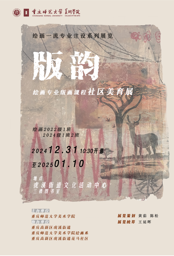2024年12月31日,由重庆师范大学美术学院主办、绘画系承办的“版韵——绘画专业版画课程社区美育展”在虎溪街道文化活动中心三楼图书室开幕。出席开幕式的有重庆师范大学美术学院党委书记刘清泉、院长罗晓欢、花马社区书记彭晓维、美术学院美术馆馆长于波、绘画系主任王延晖、课程指导教师黄茹和陈松,以及绘画系的教师和同学们。开幕式由于波馆长主持。