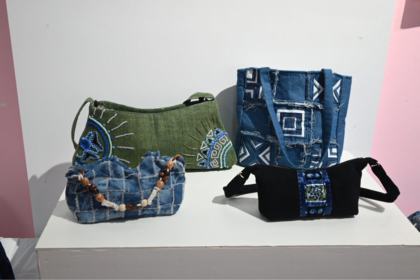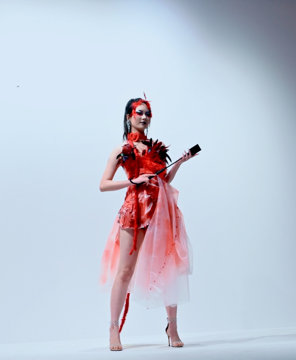 动态秀后,观众移步至静态展区。静态展区颇显匠心,这里陈列着 22/23/24 级服装与服饰设计专业学生的作品。22 级手工印染作品以蓝染晕染惊艳众人,23 级女装设计通过解构重塑时尚边界,立体裁剪作品以褶裥肌理诠释服装 "形" 的语言。展区内,《服装图案》课程的山城主题丝巾、T 恤,《面料再造》课程的做旧拼贴面料、非遗刺绣工艺等作品兼具艺术价值与实用功能,全面展现了学生在创新能力与实践技能上的成长。