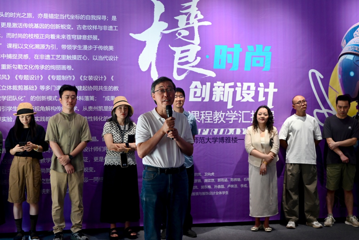 服装与服饰设计专业负责人周福英教授解读展览内核,以“传承文化根脉,激发时尚创意”为目标,组建跨课程教学团队,从开学初的方案研讨,到教学中的任务分解与重组,始终坚持成果导向、任务驱动,跨课程协同,构建文化创意设计创新生态。