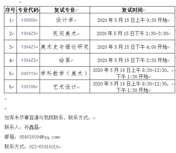 欢迎参加我院2020年硕士研究生复试,复试名单、复试方式、复试内容详见重庆师范大学研究生官网《重庆师范大学2020年硕士研究生复试通知》(网址:https://graduate.cqnu.edu.cn/info/10540/92249.htm),请按相关要求进行“远程网络面试系统”的下载、注册、缴费、提交资料等。现将我院各专业的复试时间公布如下: