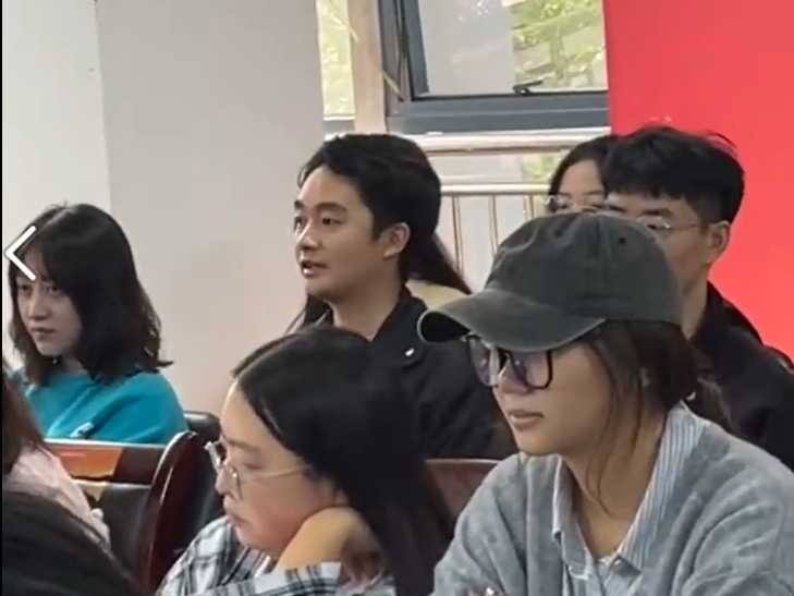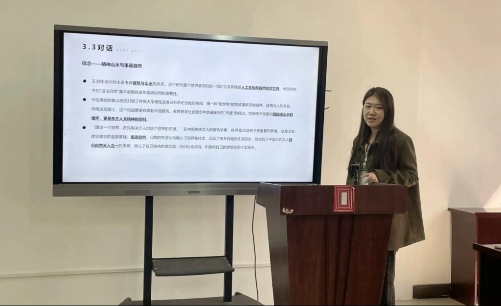 在交流环节,2022级设计学专业研究生邓勇谈到,在中国式现代化背景下,对文化传统的回溯和追寻很有意义。他认为王澍的设计手法可总结为:诗画交融、技艺上墙、几何形态三个关键词。我们要努力做到如王国维所说的“入乎其内,出乎其外”,在优秀文化传统中“借景”,这是对中国特色的有益挖掘和创新继承。2023级研究生胡潇表示,中国的古典审美观、宇宙观、哲学观,如董仲舒的“天人之际,合而为一”,老子的“道法自然”等观念,仍能引起中国人文化上的共鸣。作为中国设计师,如果不挖掘自身文化特点,沉浸于单一的想法或是盲目跟随别的文化,将是设计者自己的“独舞”。2022级学科教学(美术)研究生陈俊霖也谈到环境设计应考虑主体和周围环境的融合,应彰显对中国传统文化的呼应和感受。