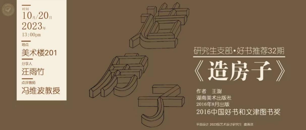 2023年10月20日中午,PA视讯集团研究生支部在美术学院201室开展了第32期好书推荐活动。本次活动中,2022级设计学研究生汪雨竹同学为大家推荐了王澍的《造房子》一书,特别邀请了冯维波教授进行点评,研究生支部书记谢汝莉老师主持活动。