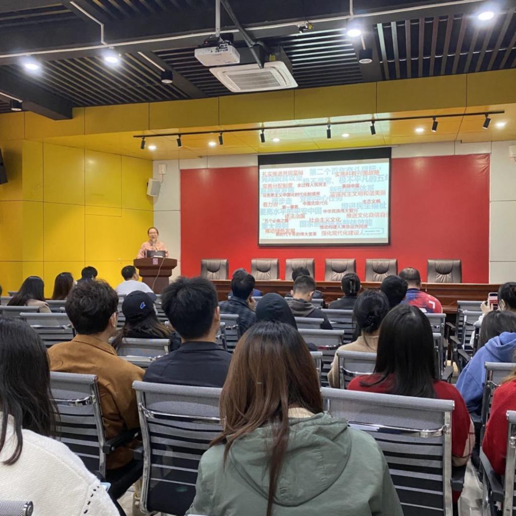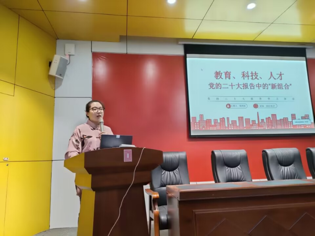 2022年10月27日下午,美术学院教工一支部书记倪纯如副教授以《教育、科技、人才 党的二十大报告中的“新组合”》为题,在南门花马讲堂带领全院党员学习“党的二十大精神”内容。