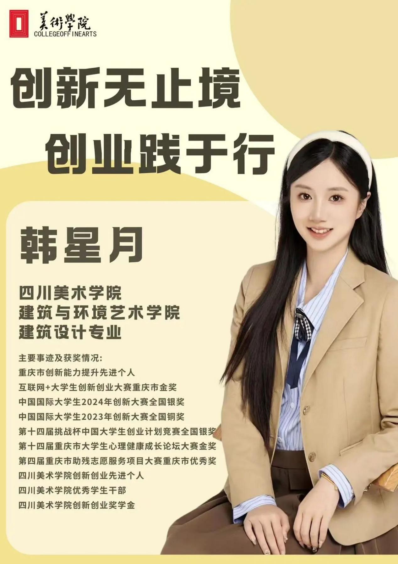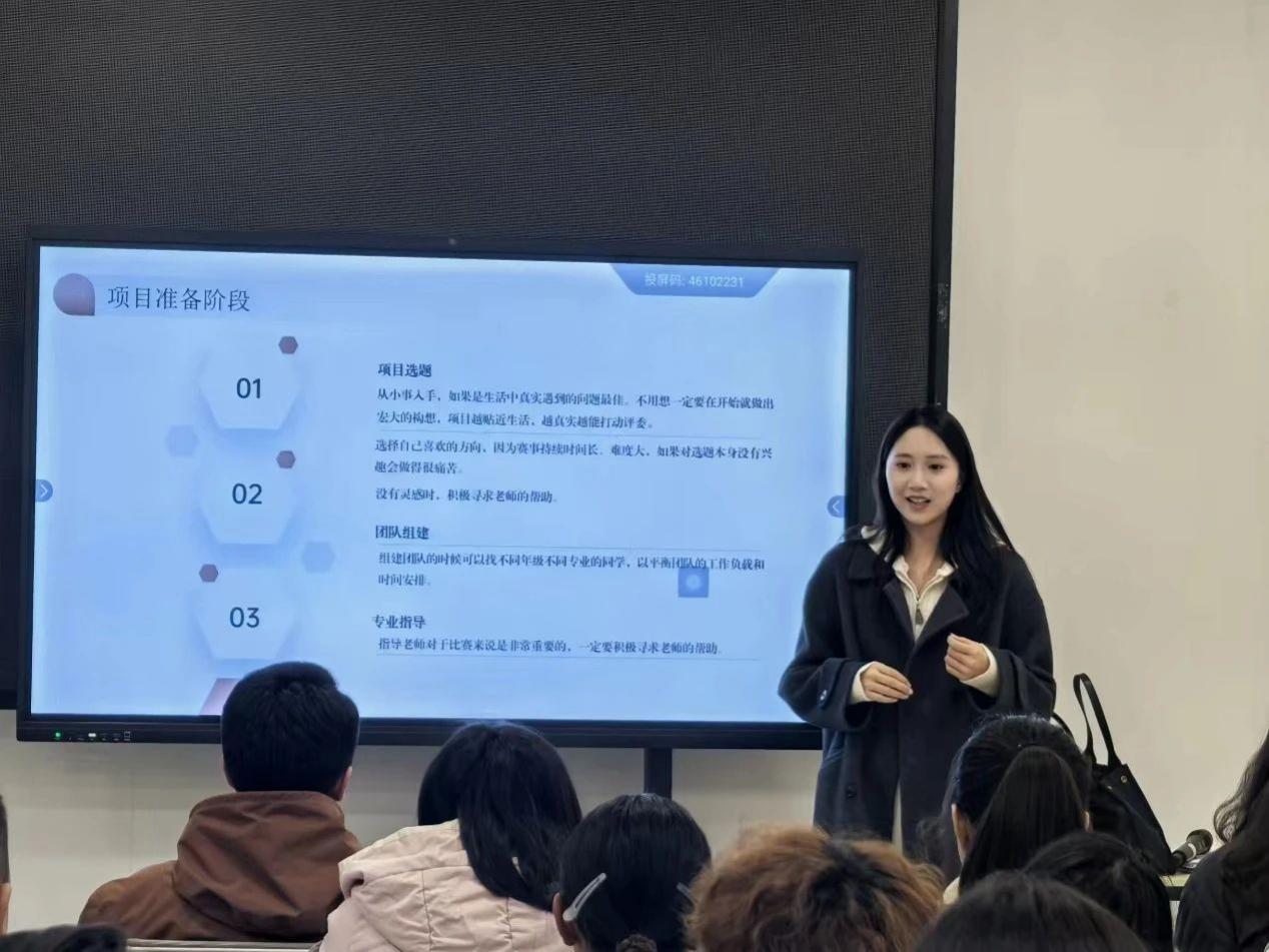 活动特别邀请了2024年中国国际大学生创新大赛全国银奖得主、四川美术学院建筑与环境设计学院的韩星月同学作为主讲嘉宾。韩星月同学以“创新无止境,创业践于行”为主题,向同学们分享了自己四年来的项目打造和参赛经验。