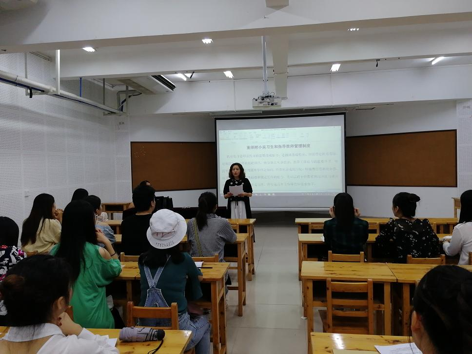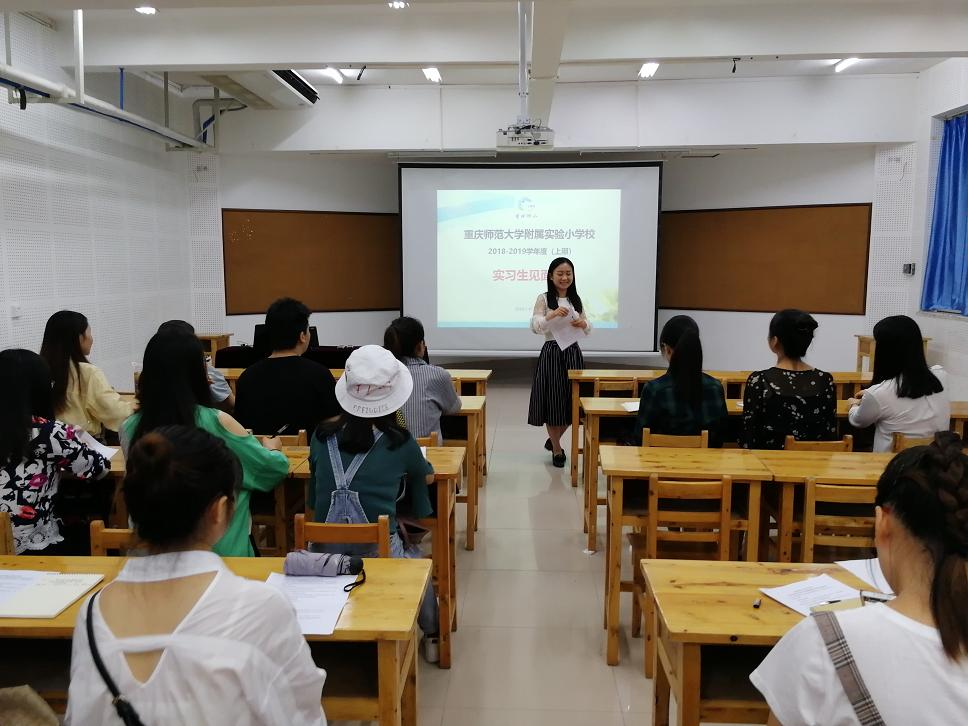 7日上午8:30,来自重庆师范大学的美术学院、数学学院、体院学院等不同学院的实习生,受到了重师附小的热情接待,并举行了教育实习见面会,见面会由重师附小校办行政中心老师潘英爽主持,重师附小汤晓红校长在会上发表了重要讲话,对参加本次实习的学生表示热烈的欢迎,并就安全、纪律、教学等方面对各位实习教师提出要求并作了指导教师分组,要求并希望各位实习教师认真做好教育实习工作,善始善终,争取良好的实习效果。之后,朱锦秀院长也发表了讲话,首先感谢重师附小的各位领导及老师们给我们的学生如此好的机会来重师附小实习;其次,对学生们提出了教育实习的相关要求和希望;最后,祝愿同学们都学有所获。
