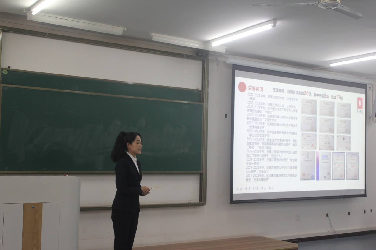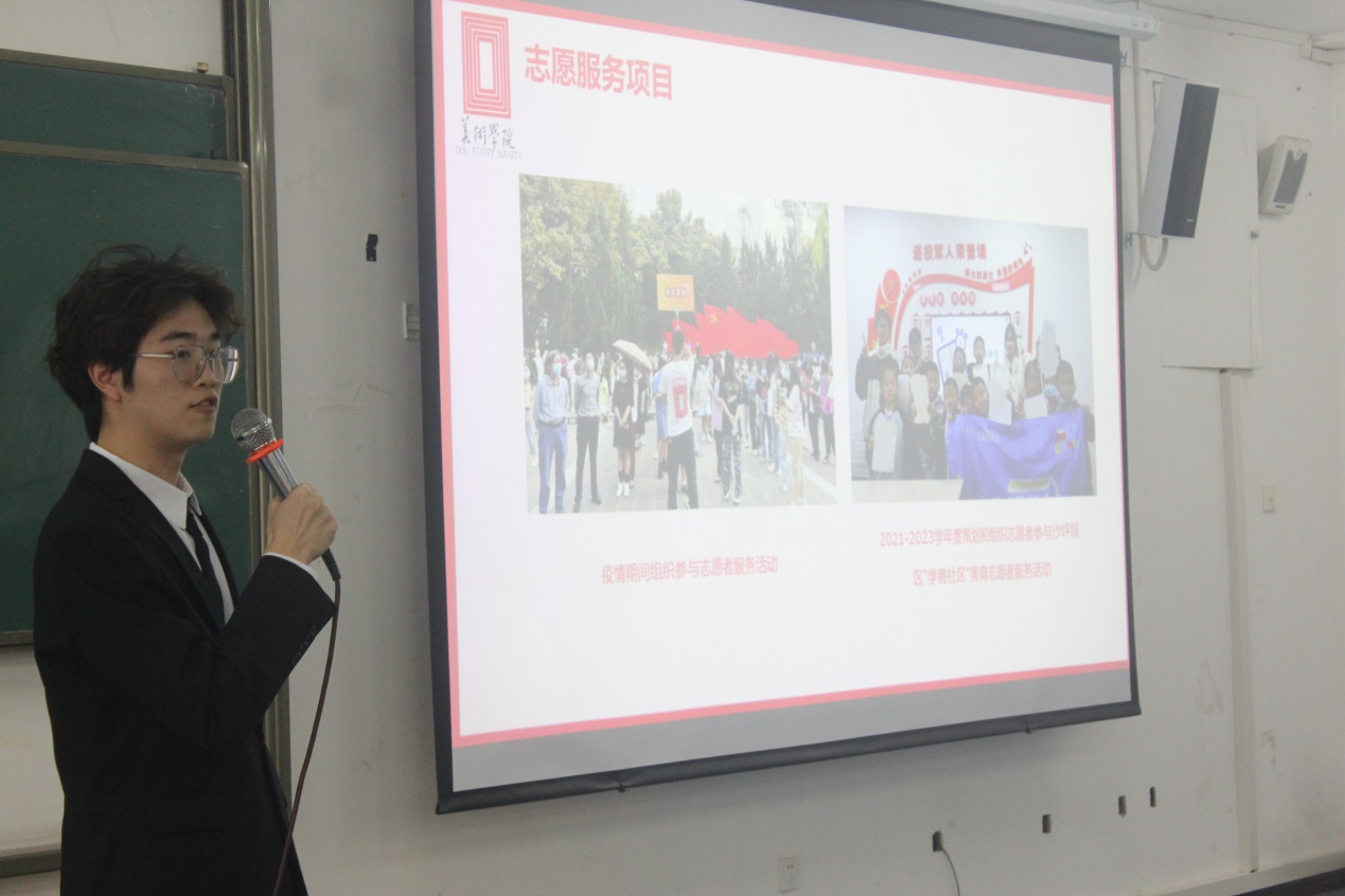 现场展示分为先进集体类和先进个人类,采取PPT汇报方式分类进行。参评候选人根据各自基本情况、优势、成绩以及未来的方向依次进行演讲和展示。先进集体候选者从班风及凝聚力、班级建设、支部建设、社会实践以及班级特色活动等方面进行了答辩展示;先进个人类候选人从思想品德、学业成绩、科学研究、社会实践、文体活动、志愿服务、社会实践、榜样引领等多方面依次向大家进行展示,本次评优评先现场遴选展示活动充分展现了美院学子拼搏进取、博学竞先的精神风貌和良好形象。