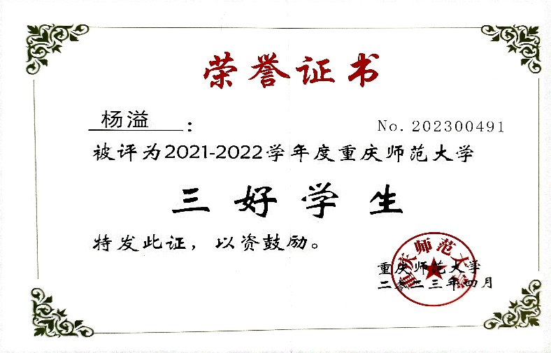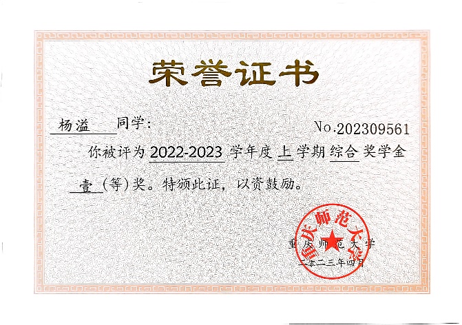 杨溢,女,中共党员,重庆垫江人,就读于重庆师范大学环境设计三班。现已成功保研至重庆大学攻读硕士研究生。