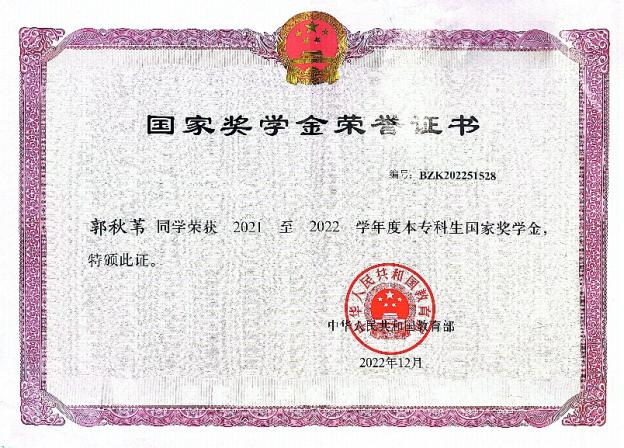 2021-2022学年度获本专科生“国家奖学金”;