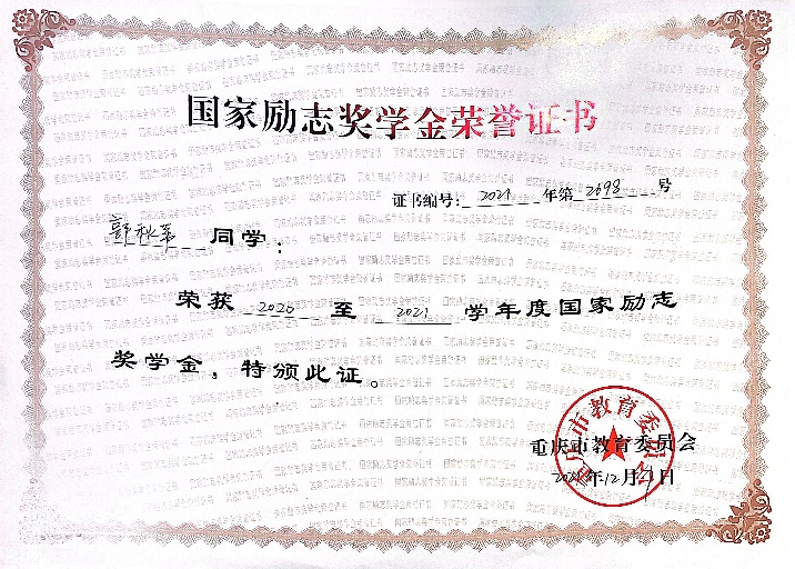 2020-2022学年度获“国家励志奖学金”;