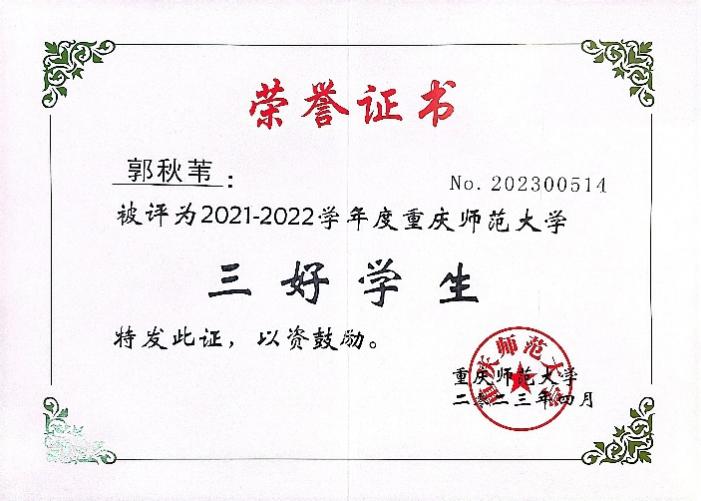2022-2023学年度获重庆市“三好学生”;
