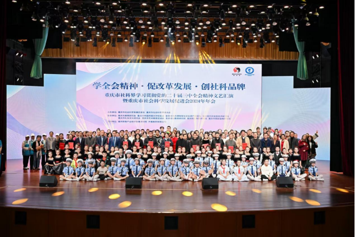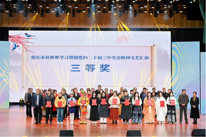 3月7日,重庆市社科界学习贯彻党的二十届三中全会精神文艺汇演暨重庆市社会科学发展促进会2024年年会在南岸区文化艺术中心成功举办。由美术学院选送的节目《古韵新裁、非遗霓裳》在重庆市社科界文艺汇演中获得“三等奖”。