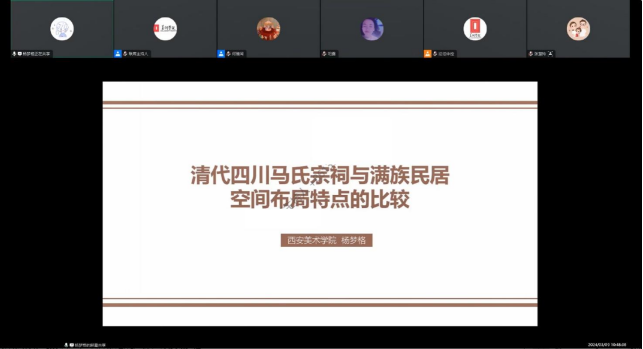第二位发言人是西安美术学院的硕士生杨梦格,发言题为《清代四川马氏宗祠与满族民居空间布局特点的比较》,她通过比较分析马氏宗祠与满族民居,探究了不同的布局特点与当地的习俗、建筑性质、作用等因素有关,认为两者相似的风格是由于受到了当时移民政策、军事布防等原因的影响。