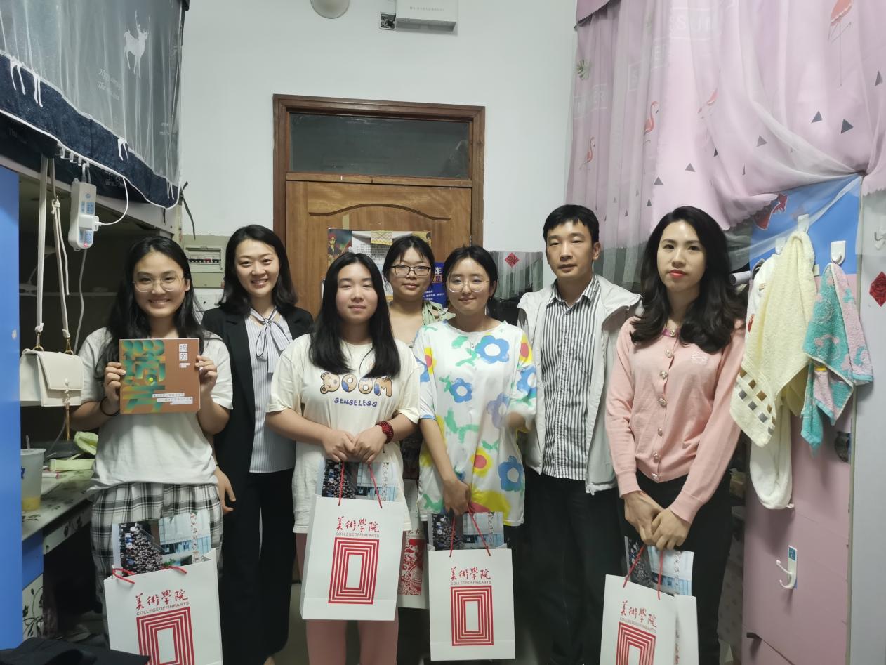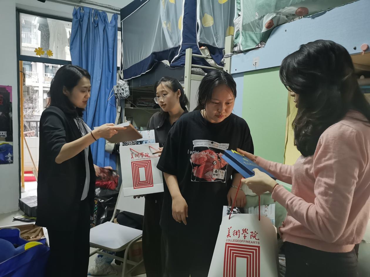 2023年6月16日,美术学院开展"母校有我---走访毕业生寝室活动"。晚上8点学院党委副书记丁睿代表院党政领导班子,带领2023届毕业年级辅导员余艳婷、张云霄走访了雅风苑园区,走访研究生和本科生寝室,看望、慰问同学们,向毕业生送上毕业祝福。