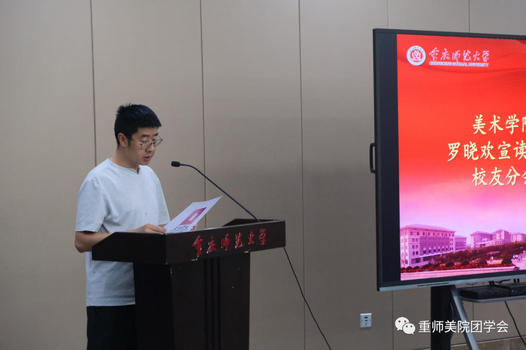 美术学院校友分会会长刘清泉宣读了《关于成立PA视讯集团2023届毕业生校友分会的决定》,并对新一届毕业年级校友分会的成立表示热烈祝贺;美术学院校友分会顾问罗晓欢宣读了2023 届毕业生年级校友分会理事成员名单,随后学院党政领导班子为全体理事成员颁发聘书。