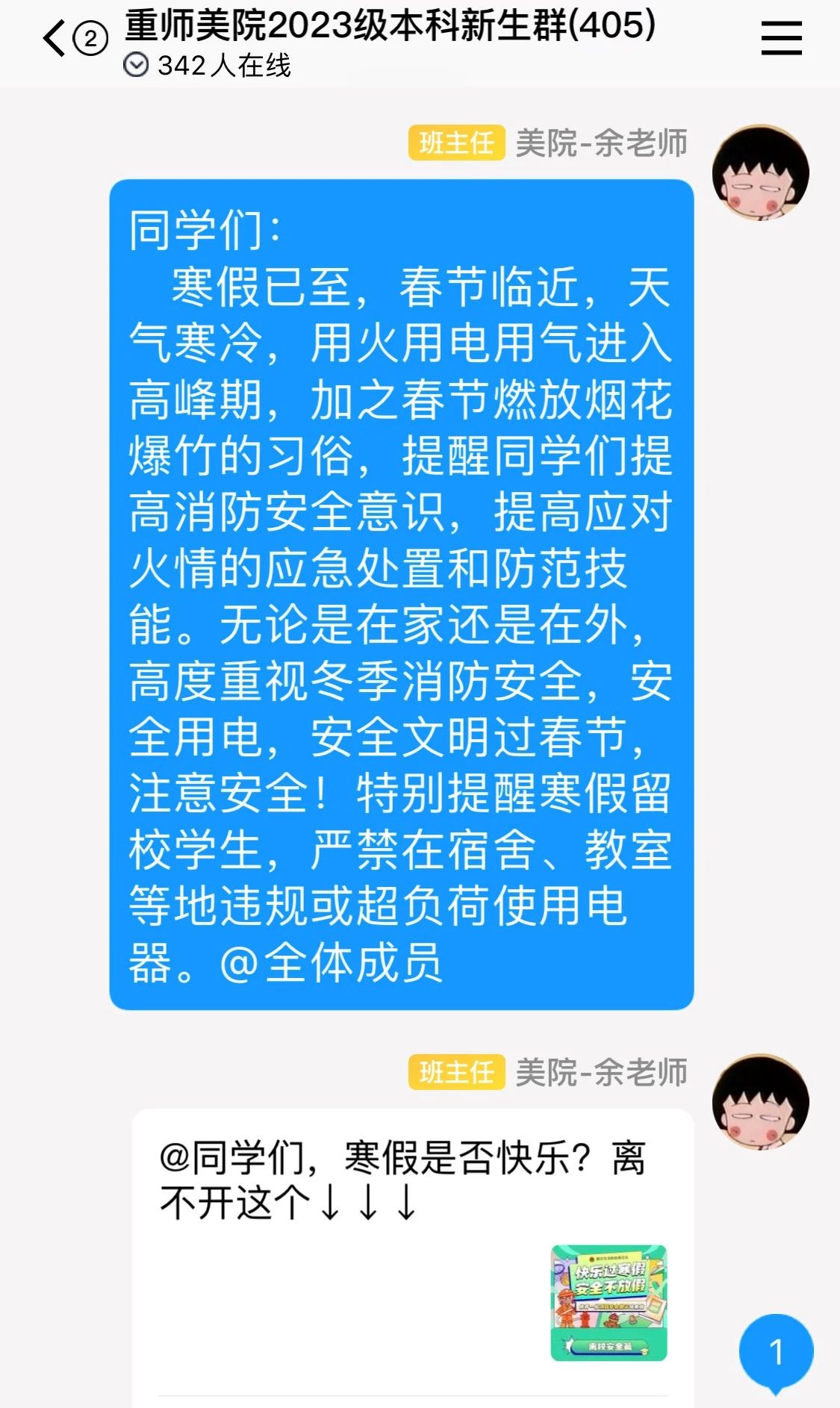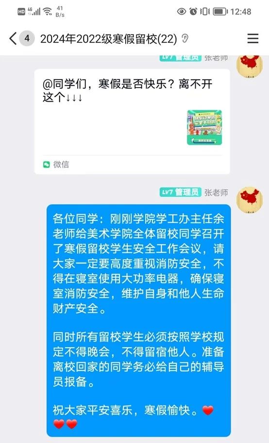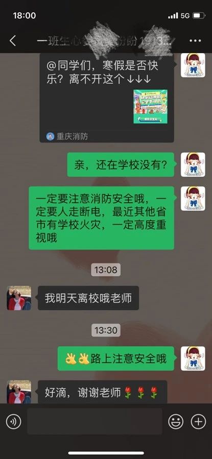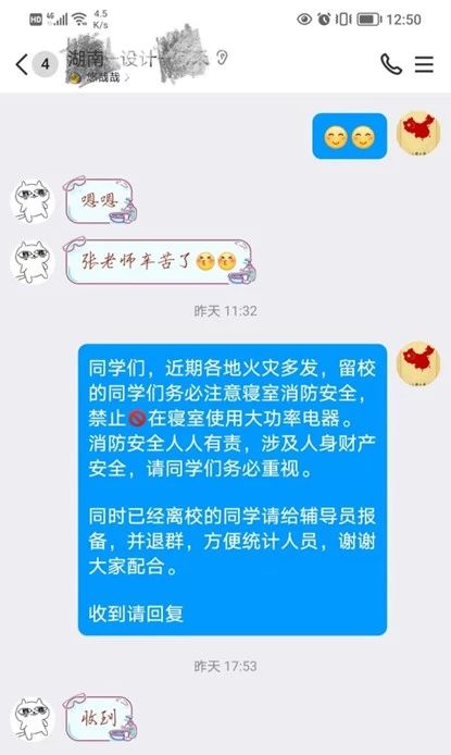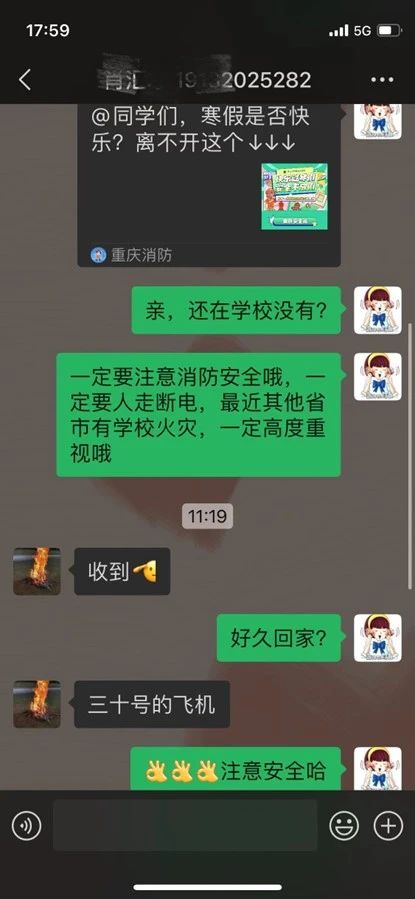此外,各年级辅导员通过班级群以及点对点关心提醒,充分了解学生状态,强调了消防安全等问题。