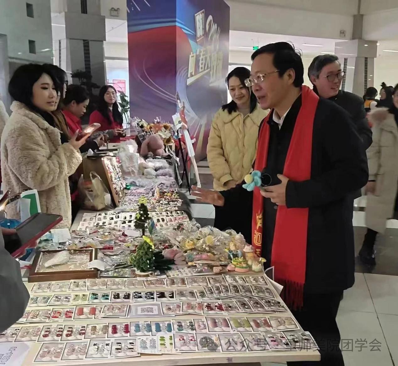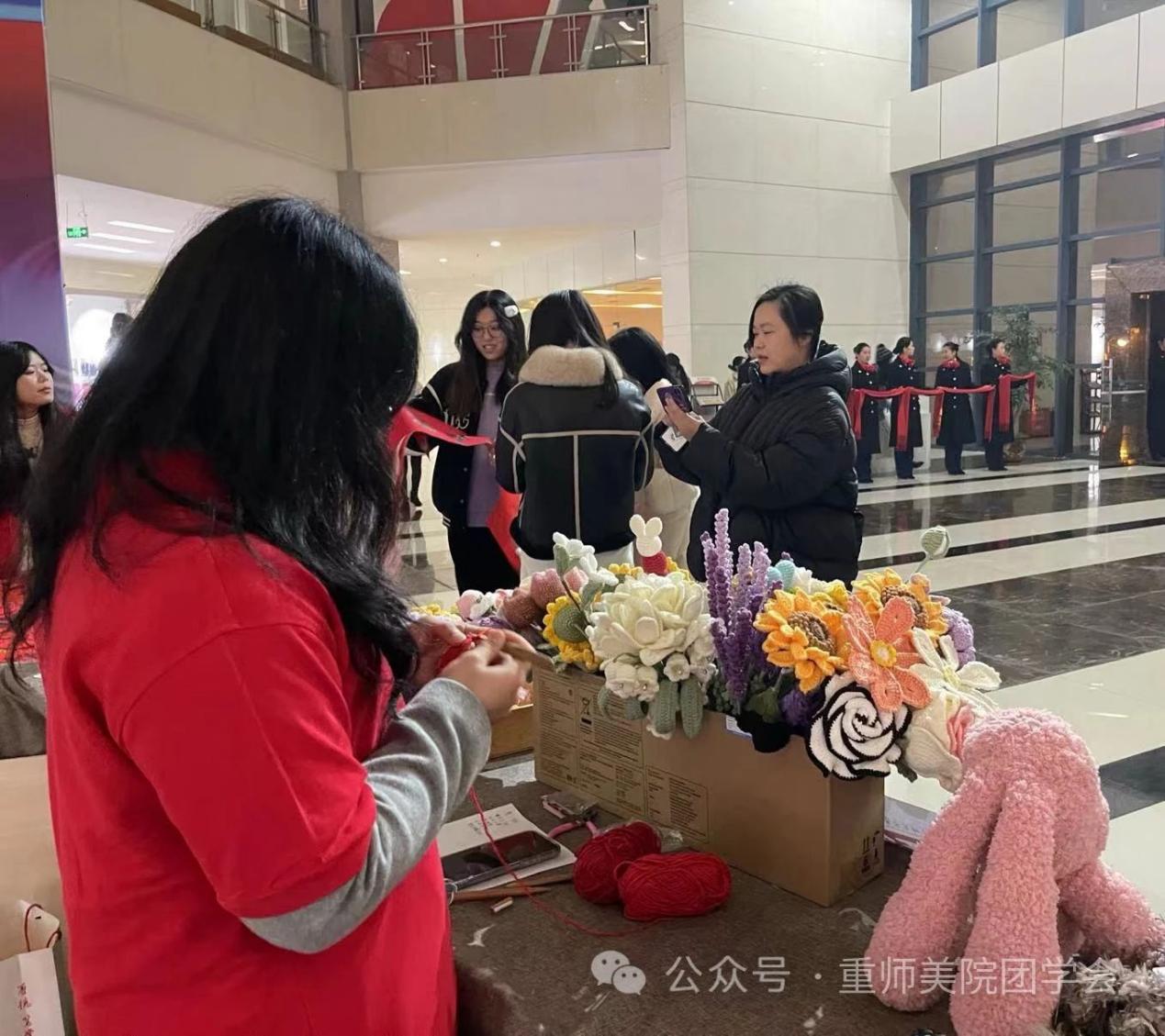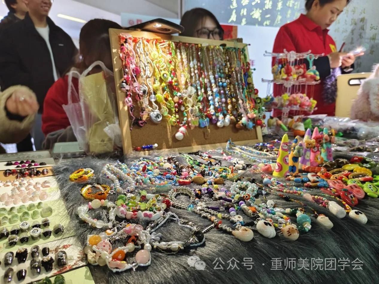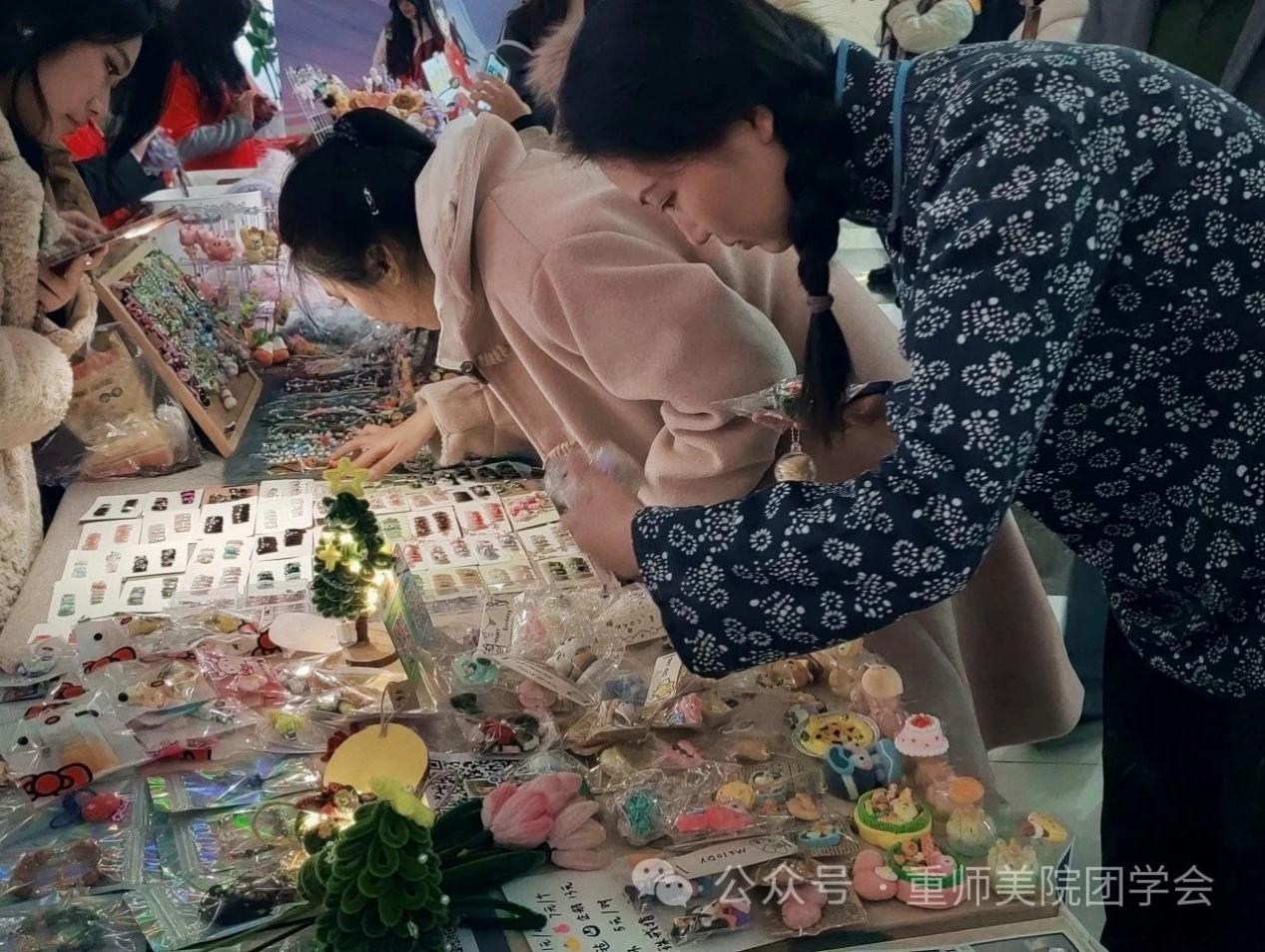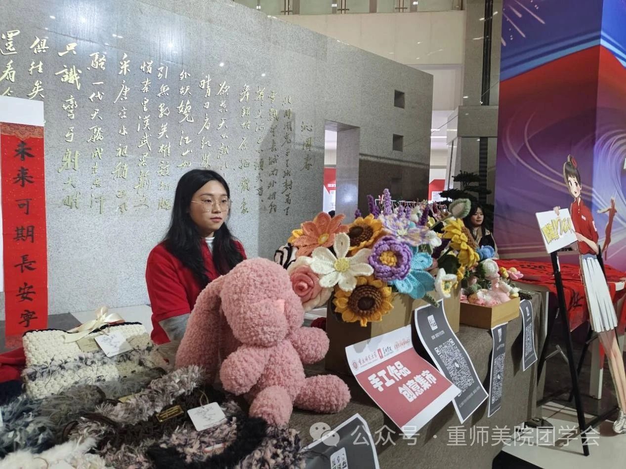 2023年12月29日,美术学院朋辈心园受学校委托,营造新年氛围,在校友会堂打造“美院心灵手作定制集市”,展示学生制作的数百件手工作品,每个作品都展示了同学们丰富的想象力和独具匠心的设计理念。