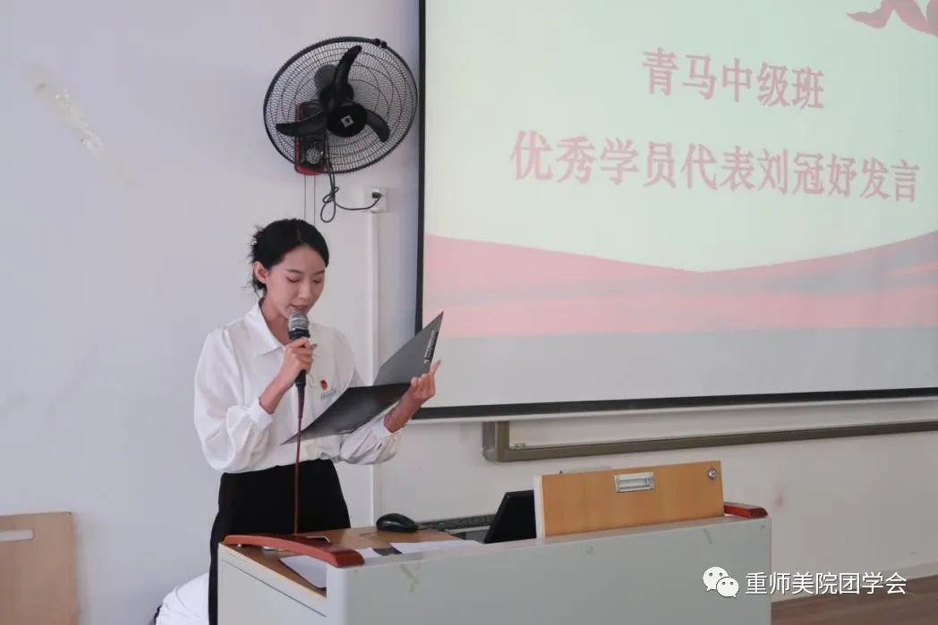 随后,青马中级班优秀学员代表刘冠妤上台发言,讲述了自身的学习心得和成长经历,激励了同学们学习的趣和热情,引领同学们向优秀看齐,向前进发。