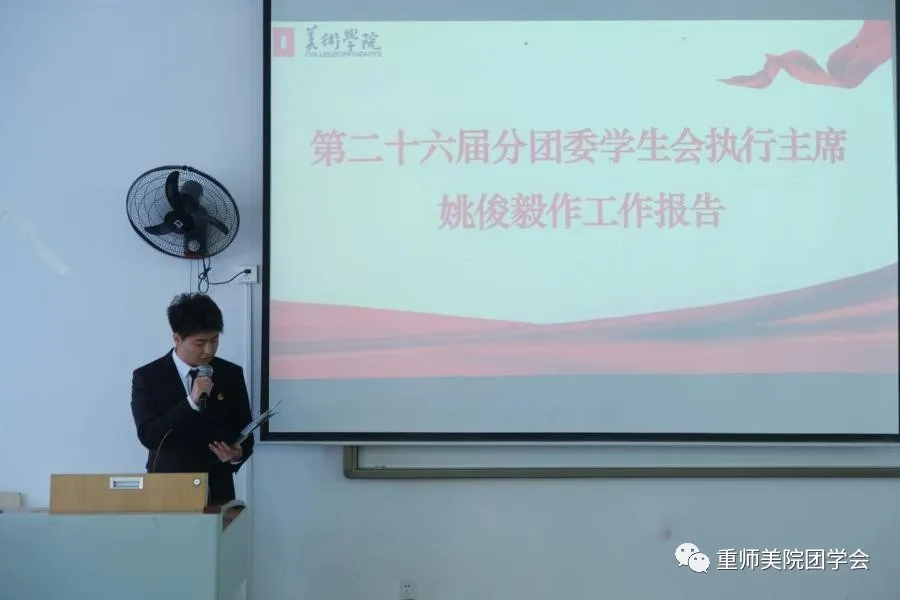 会议第三项,由第二十六届分团委学生会执行主席姚俊毅上台作工作报告,主要从以下四点来介绍美术学院的团学工作。第一,加强青年思想引领,扎实开展日常团建工作。以学院各年级团支部、青马班为依托,开展系列共享团课活动,让理论知识入心入脑。第二,学生干部典型作用见成效,创先争优氛围浓厚。美院美生、学生党员榜样引领,朋辈示范效应凸显。第三,学教联动,切实发挥“第二课堂”育人作用。结合学院特色,开展德智体美劳系列活动,充分发挥第二课堂育人成效。第四,加强分类指导,助力学生创新创业。积极开展创新创业指导服务,助力学生就业创业。同时也表示美术学院分团委全体成员将不忘初心,砥砺前行。