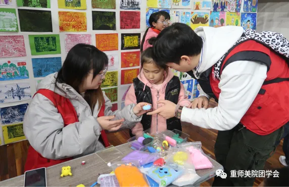 首先,志愿者们带领小朋友们前往体育馆二楼,来到美术学院展区,小朋友们学习做扭扭棒、学习捏黏土和赏析画作。美院学子们认真讲解,悉心教学,让小朋友们在探索中学习,激发他们的创新思维。