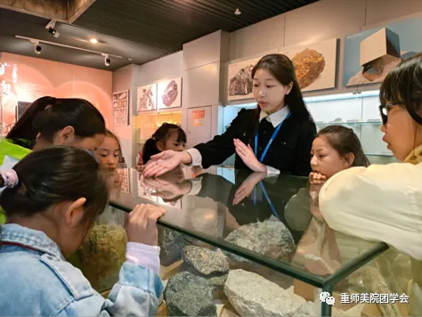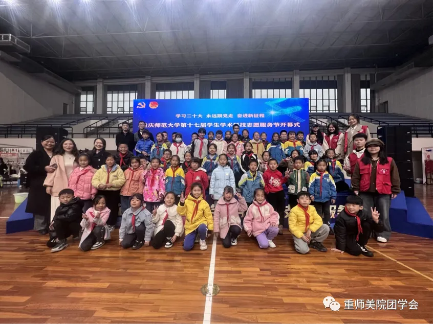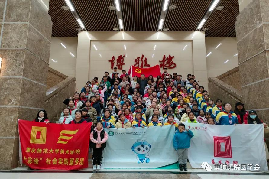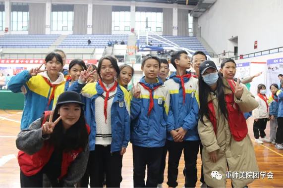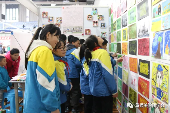 童心探科学,逐梦创未来。2023年11月30日,重庆师范大学第十七届学生学术科技志愿服务节在我校体育馆顺利举行,我院“高参小”美育实践服务项目主要服务附属学校,特邀请重师附二小龙兴校区的老师和同学们也前来参观我校第十七届学生学术科技志愿服务节。附二小王建老师、美术学院党委副书记丁睿、美术系系主任赵忠华、辅导员张云霄带领孩子们参观了学术科技志愿节和博雅楼展馆。此次活动是高校资源向基础教育延伸的一次重要实践,也是学院美育实践活动服务乡村振兴的一次积极尝试,体现了学院以美育人、以文化人、以艺铸魂的理念。