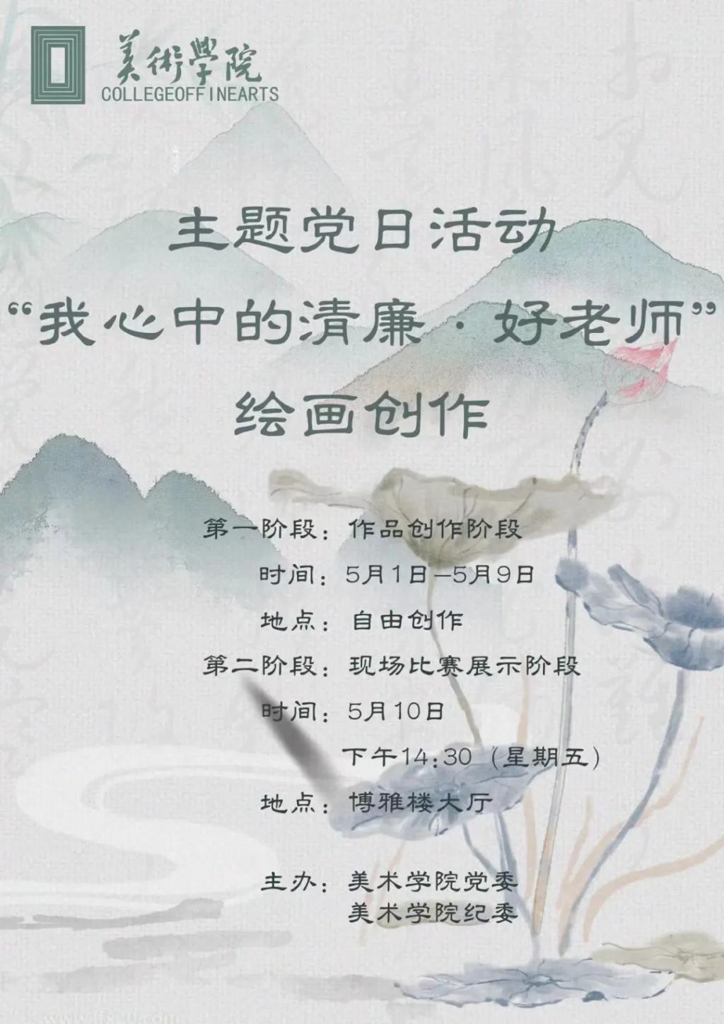 为弘扬教育家精神,培育高尚育人情怀,塑造廉洁仁爱的师德师风,美术学院党委拟在学生支部开展“我心中的清廉·好老师”主题绘画创作活动。现将相关事宜通知如下:
