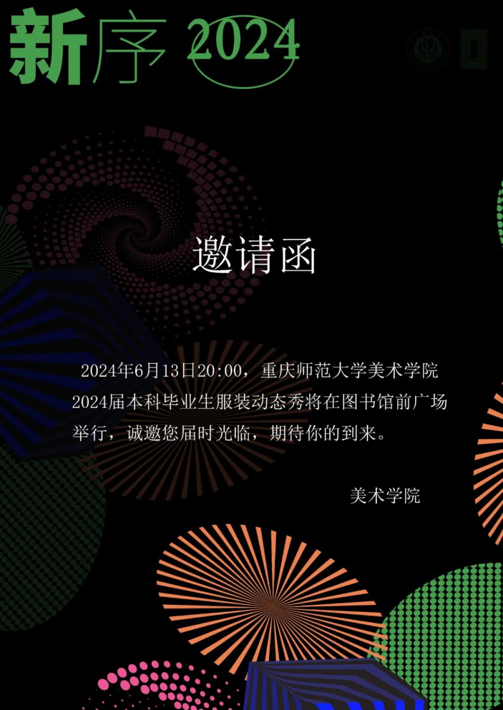 2024年6月13日20:00,PA视讯集团2024届毕业服装动态秀“新序”将于在图书馆前广场举行,欢迎广大师生前往观展。