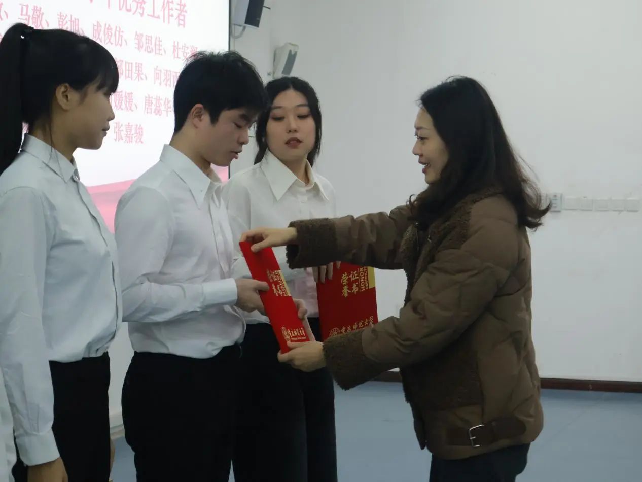 在表彰环节,学院领导为第十七届青马初级班优秀学员以及2024-2025学年“优秀工作者”、“优秀志愿者”颁发了荣誉证书。这些优秀学员和学生干部以实际行动诠释了新时代青年的责任与担当,为全体同学树立了榜样。受表彰学生代表石雨露在发言中分享了自己的学习心得和成长经历,激励同学们向优秀看齐,不断追求卓越。