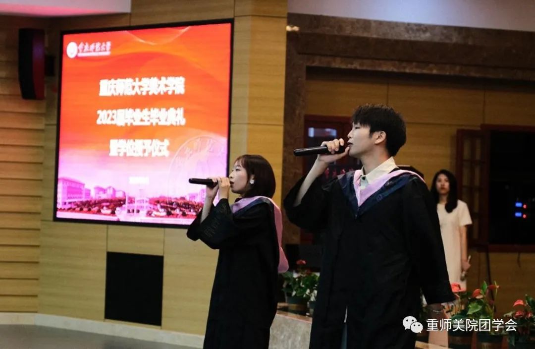 毕业典礼开始前,陈历爽和邓庆玲两位同学带来歌曲《凤凰花开的路口》《再见》。美术学院2023届毕业纪念短片《最好的我们》拉开了美术学院2023届学生毕业典礼暨学位授予仪式