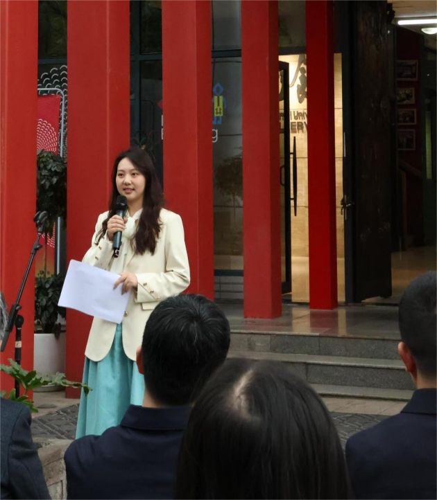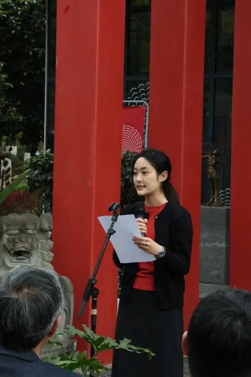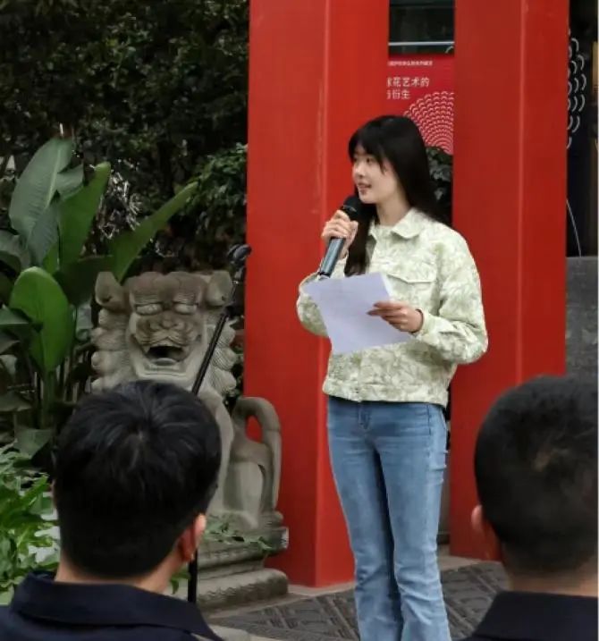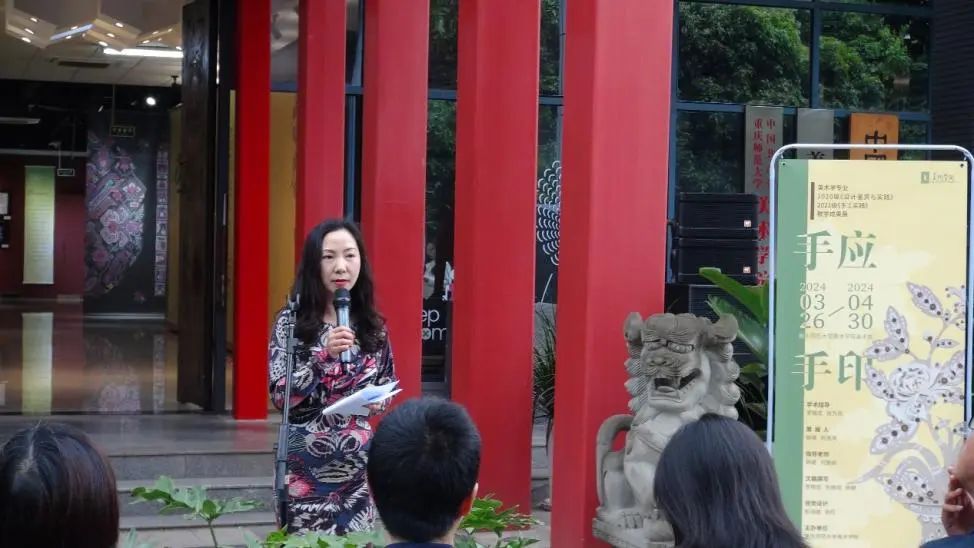 何雅闻老师诚挚地感谢了学院领导班子、行政老师和美术系的教师们对此次教学成果展的大力支持,并特别感谢了杨珺老师的细心指导和帮助,重庆市大圆祥博物馆刘馆长的支持和持续关注,巫溪嫁花策展团队的教学资源支持以及为本次展览付出的同学们。最后,她对学生们寄予深切的期望,希望同学们把这次展览作为一个起点,保持团结协作、精益求精的精神,继续用自己的方式讲述好中国故事。