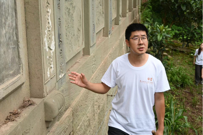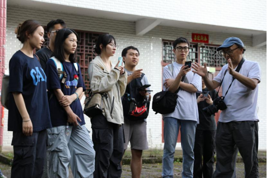 随后,在赵青松所长的带领下工作坊成员们来到了古树嘴的长五间石刻。罗晓欢教授强调,同学们应关注乡村聚落的环境和状况,石刻的文字和图像反映了当时人们的观念和理想,是体现中国传统文化和核心价值观的物质载体。观察这些建筑细节时,同学们要从艺术学的角度关注这些文字和图像是如何以艺术化的方式呈现的。此外,观察这些细节时,既要远观整体环境,也要近观细节,多角度分析,传统建筑通常兼顾了功能性和装饰性,同学们可以尝试以此为基础进行个案研究。虽然这些建筑还不是特别重要的文物,但在中国传统社会中具有重要的文化价值。