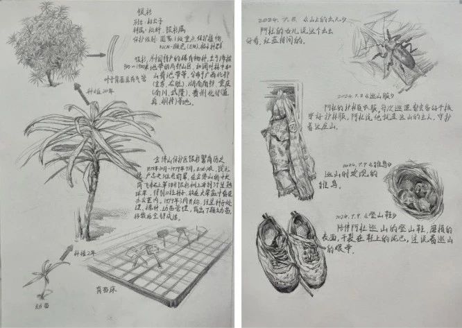 在见习的三天时间里,师生们和护林员一起吃住,一起体验巡山工作,通过亲身经历护林员的工作和生活,深刻理解了他们的辛勤与奉献,以及国家级自然保护区在生态系统中的重要性。此次活动不仅让学生们将课堂知识应用于实践,还从自然和人文角度探索了主题性绘画的创作灵感。这不仅是对学习成果的检验,也是一次生动的劳动美育实践。学生们在金佛山的自然美景中,用画笔记录护林员的形象,同时在心中培养了对自然保护的尊重和热爱。这次见习活动使学生们在实践中学习,在体验中成长,为他们的艺术之路增添了宝贵的经验。