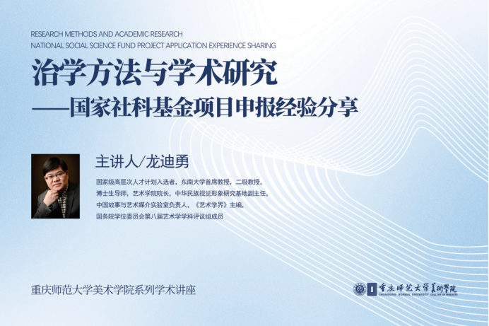 2024年11月22日上午,东南大学艺术学院院长龙迪勇教授在重庆师范大学博雅楼501主讲“治学方法与学术研究——国家社科基金项目申报经验分享”专题讲座。讲座由美术学院院长罗晓欢教授主持。