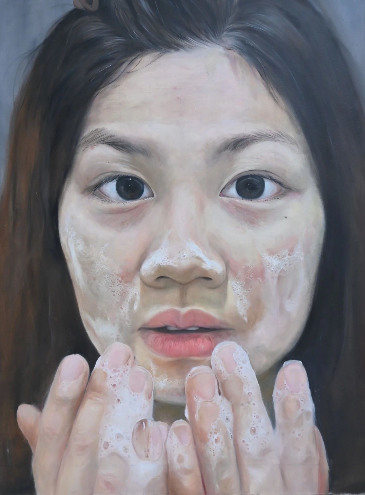这幅自画像我选择记录下自己洗脸的一个瞬间,这是一个“卸下伪装”、十分放松的片刻。完成这幅自画像,记录了当下这个时刻的我,也留存了我在创作中对自己更深层次的感悟。