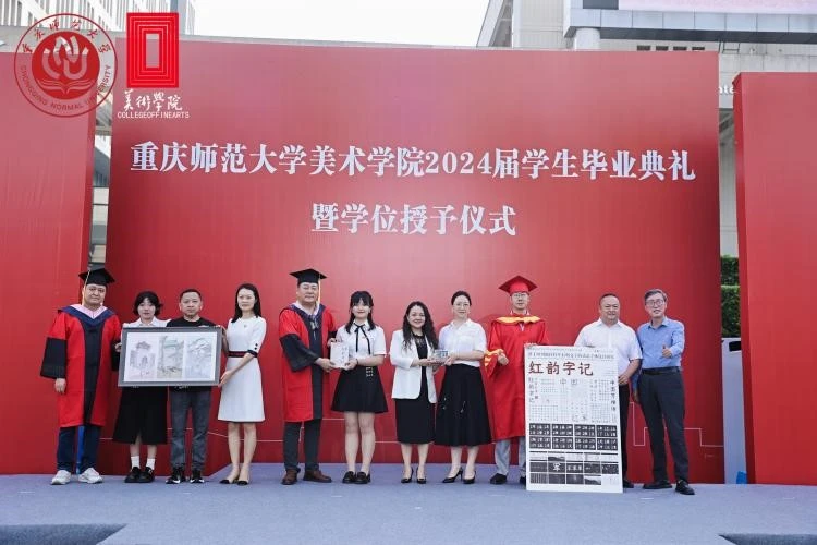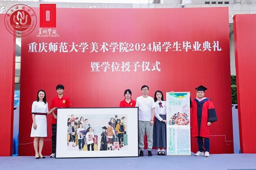 本科毕业生代表2020级美术学屈鹏及指导教师赵忠华、研究生代表2021级艺术设计李婷及导师罗晓欢教授向学院赠送毕业作品。