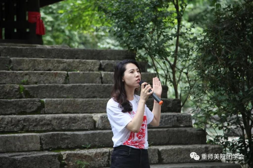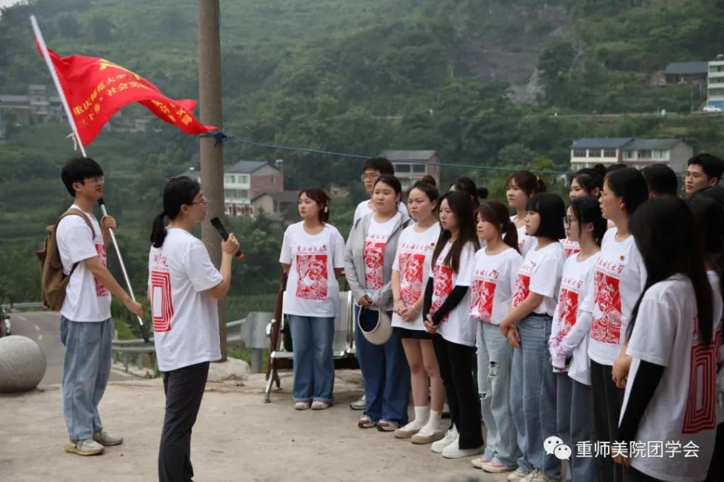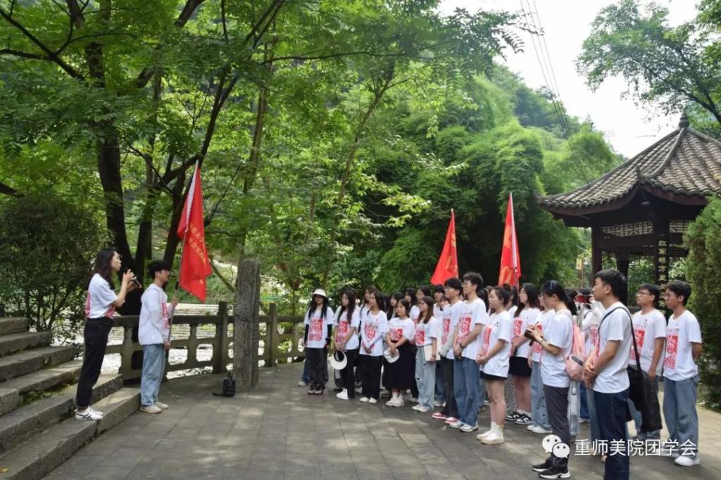 7月3日清晨,在綦江区石壕镇红军桥址前,院分团委书记兼学工办主任余艳婷老师以“赓续红色经典 培育时代新人——新时代长征路上的艺术思政”为题给同学们上了一堂生动的现场微党课,提到:一是追寻历史的足迹,重温红色经典,二是坚守红色信仰,弘扬长征精神。勉励同学们追求远大理想,坚定崇高信念,结合专业特长和红色文化背景以暑期三下乡社会实践为契机做系列主题性艺术创作,希望大家秉承学院艺术+思政,美育+实践,美育+劳育的培养理念,坚持知行合一,在创造美的实践中成长为德艺双馨的美育实践者、艺术工作者,为服务乡村文化振兴和地方发展贡献自己的青春力量。
