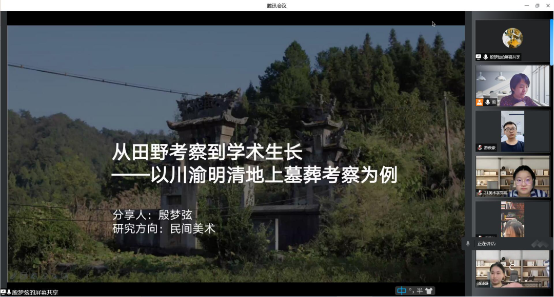 2022年6月21日中午,美术学院研究生支部党员殷梦弦以《田野考察与学术生长——以川渝明清地上墓葬为例》为题,在腾讯会议上分享自己的学习经验。殷梦弦围绕如何具体展开田野考察工作进行阐述,并对她的研究对象——清代川渝地区地上墓葬的考察进行实例分析,帮助同学们了解在具体的考察中要做些什么,以及如何灵活应对。