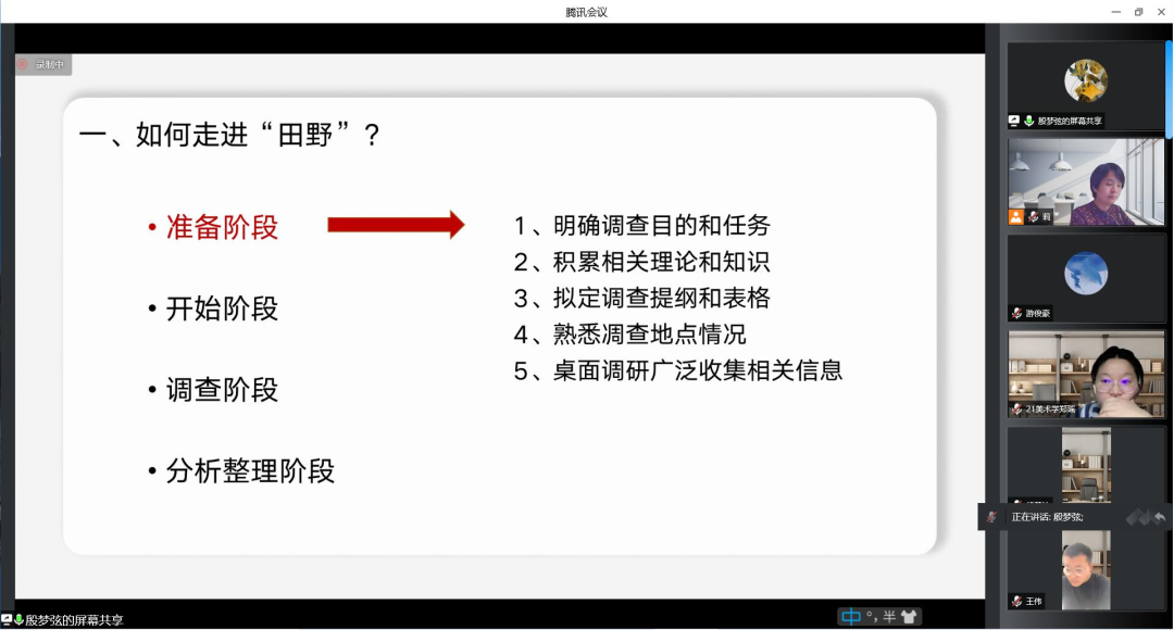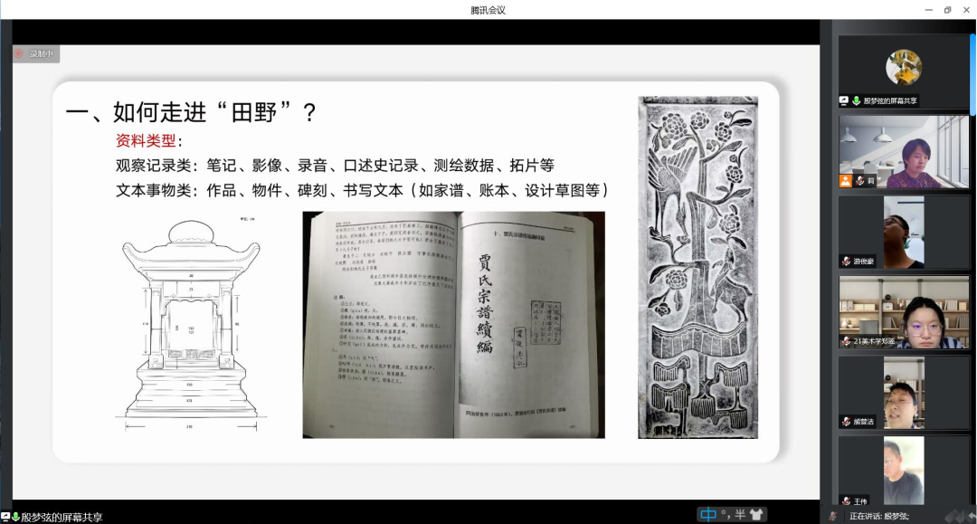 首先,殷梦弦同学介绍了进行田野考察的四个阶段:准备阶段、开始阶段、调查阶段、分析整理阶段。在准备阶段,应当先了解调查地点具体情况,广泛收集相关信息积累相关资料,明确调查目的和任务,并拟定调查提纲和表格;开始阶段要提前与地方职能部门以及被调查对象取得联系,从衣、食、住、行、人等方面做好准备;调查阶段,一定要注意入乡随俗,尊重当地的风土人情、礼仪禁忌,在调查过程当中要仔细观察,灵活变通,不放过每一个细节,做好详细的记录,充分利用摄像、录音、测绘、拓印等专业工具和方法;最后在分析整理阶段要将自己田野考察的资料进行分类,最好是拍摄当天完成整理,以便于后期研究使用。可以分为记录类,包含笔记、录影、录音、口述史记录、测绘数据、拓片等;实物类,包含作品、物件、碑刻、书写文本(如家谱、账本、设计草图等)。