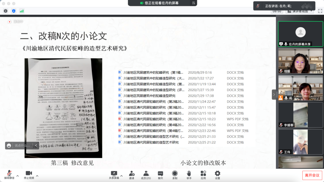 第二篇论文从一稿完成到投稿历时近四个月,论文题目也经过一次又一次的反复修改完善。陈在丹同学向我们展示了论文修改过程中导师的批注以及她自己记下的密密麻麻的笔记。这篇论文写作的过程分为三步:第一步是图片资料收集。进行实地考察,对研究对象进行拍摄和数据测量等工作。把通过各种途径,例如网络、书籍、博物馆以及实地拍摄的建筑图像分类管理。第二步是文献搜集。查阅相关文献、书籍,此时要注意选择高质量的期刊文献,并且对已经查阅的文献分类整理。第三步是论文写作。首先梳理论文大纲。大纲关系着全文的布局和排版。重点聚焦于层次的清晰度、结构的完整度、文章的逻辑性三个方面。其次是调整材料。材料的真实性是第一位的,再就是是否需要这个材料,不断对材料进行增、删、调。最后是优化语言。力求准确、简洁、生动,努力提升自己的语言表达能力以及专业术语的运用。