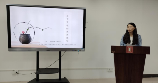 王越同学从作者简介、核心内容和个人感悟三个方面展开分享。本书有六个章节,主要论述了文化的定义、搭建文化的知识平台、中西文化的不同特征以及美术课程如何走进文化几个方面。王越同学以自己的视角从理解形象、关注视觉文化、培养多元文化观等方面分享了该书的内容。谈到读完该书后的真切感受,她认为美术课程与文化密不可分,文化对人的全面塑造非常重要,美术教学应在文化情境中进行。作为青年一代的美术教师应树立正确的文化观,传递正面的价值观,养成良好的行为规范。