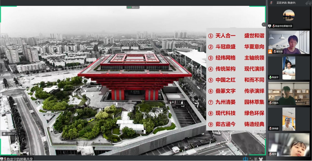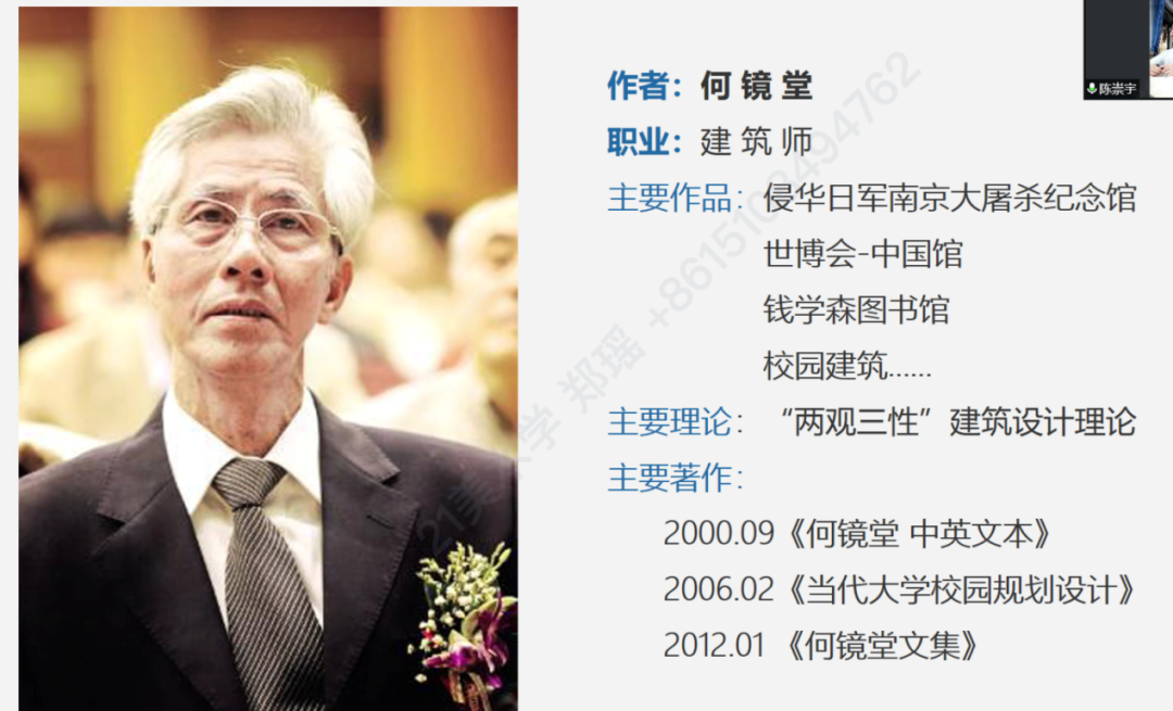 陈崇宇介绍了何镜堂先生的履历,以及他的代表性作品侵华日军南京大屠杀遇难同胞纪念馆、上海世博会中国馆和钱学森图书馆等,并以设计实例阐述了何镜堂先生非常重要的理论——“两观三性”,即整体观和可持续发展观,地域性、文化性和时代性。