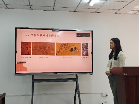 接着,廖霜颖同学分析了六个问题,即“为什么要重新研究女性题材绘画”“从女性题材绘画到‘仕女画'”“‘仕女画'概念的产生环境及方法论隐喻”“女性题材绘画的现代研究和本书使用的概念和方法”“为什么不将这些画径直称为‘仕女画'或‘美人画'?”“为什么引入‘女性空间'作为讨论的概念核心?”