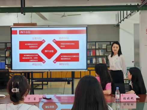 本次党课以“坚定文化自信、勇担时代使命”为题,主要从以下几个方面展开:一是介绍了文化自信的内涵,重点介绍了中华优秀传统文化。中华优秀传统文化积淀着中华民族最深层的精神追求,代表着中华民族独特的精神标识。二是介绍了美术学院深度融合入学校文化建设的各项活动,彰显美术学院人才培养特色。第一,参与打造园区标志性景观。以习近平总书记治国理政经典语句、重师文化和师生关切元素为主要内容,开展学生社区景观设计和走廊标语设计。第二,参与设计制作17个学院寝室门牌,参与创设师小博、师小雅学生IP形象设计,以及参与师小博、师小雅为人物主角设计制作寝室和园区温馨提醒。第三,丰富园区文化底蕴,参与设计制作具有学校人文特质的暖心贴士、寝室公约、墙绘等作品。第四,积极参与到70周年校庆相关活动中,结合学校历史沿革、学校建筑、校园文化等发挥专业特色,承担设计工作。三是寄语同学们了解和熟悉重师厚重的文化底蕴,激励全体党员恪守“厚德、笃学、砺志、创新”的校训精神,践行“自强不息,躬行师道”的重师精神,坚定文化自信、担当使命、奋发有为。