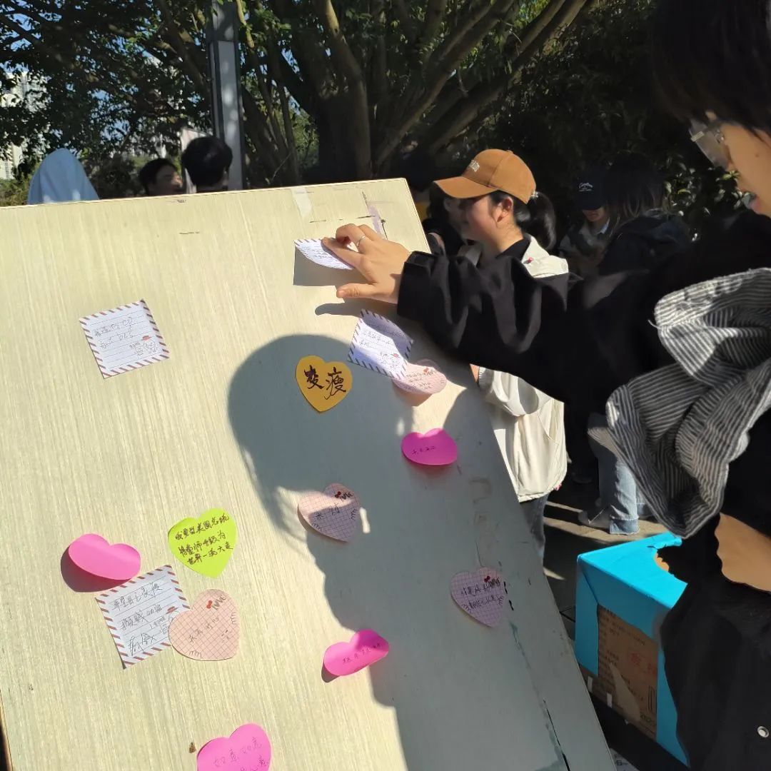 活动一开始,我们就进行了场地布置,设立了心灵树洞、拥抱自我工坊和善意传递墙三大活动区。在心灵树洞区,同学们在便利贴上写下了自己的烦恼,投进了树洞中,后续朋辈工作人员会进行烦恼解读并反馈到同学们的邮箱。