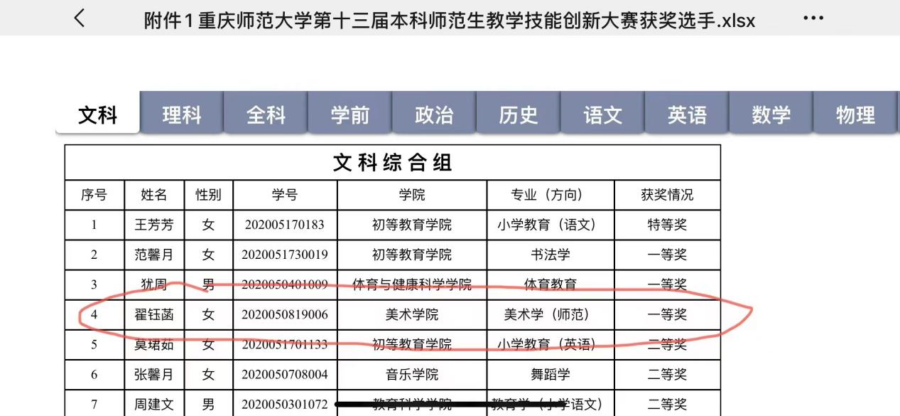 ※日前,我院2020级本科美术学专业翟钰菡同学荣获重庆师范大学第13届本科师范生教学技能大赛一等奖。