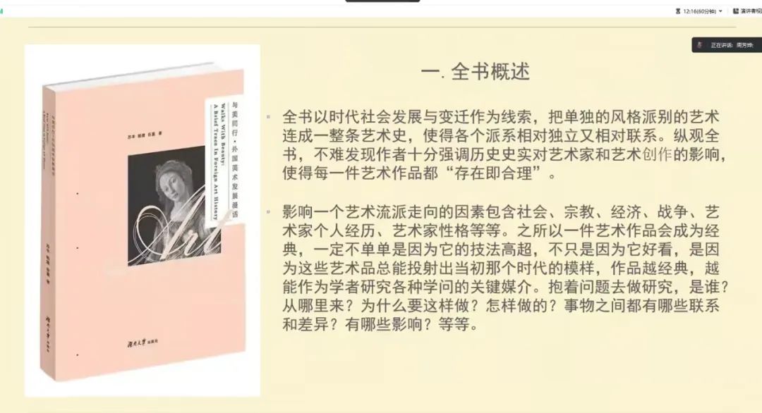 ※2023年5月19日下午,美术学院研究生支部在线开展第29期好书推荐活动。本次活动由2022级研究生周芳烨、衣涵同学共同为大家推荐《与美同行·外国美术发展漫话》一书,本科绘画专业学生代表参与了活动,教工二支部组织委员邹涛教授进行点评,研究生支部书记谢汝莉老师主持活动。