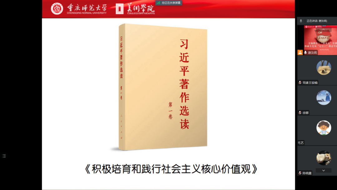 ※2023年5月24日中午,美术学院专职组织员、研究生支部书记谢汝莉老师在线开讲“共享式”党课,领学《习近平著作选读》第一卷中《积极培育和践行社会主义核心价值观》一文。本次党课既是主题教育的一部分,又是毕业生党员“七个一”教育实践活动之一。